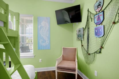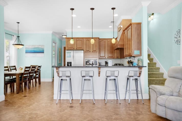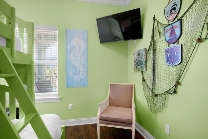 Splish Splash is a fabulous 5-bedroom, pool front home in Villages of Crystal Beach, featuring a spacious open floor plan with TWO gorgeous balconies, TWO living rooms, and TWO master suites. Splish Splash is a 3-story, corner home boasting 10-foot ceilings and 8-foot doorways and a fully equipped kitchen with granite countertops, stainless steel appliances, and a dining table plus breakfast bar. There is a queen master bedroom and a queen sleeper sofa on the first floor. A queen bedroom and a king master suite with a full-size futon on the second floor, and a bedroom with a queen bed, and a bedroom with a twin over full bunkbed on the third floor along with a second living space with a queen-sized sleeper sofa, allowing sleep accommodations for up to 16 guests. The 2nd floor master suite also features a private kitchenette/wet bar, a flat screen TV, balcony access, and an ensuite with a corner Jacuzzi tub! Enjoy your refreshments on the two balconies or relax comfortably in one of the two living rooms. This luxurious community is about 900 yds from Crystal Beach and includes a complimentary seasonal trolley service to take you to and from the Gulf!| From/To | Nightly | Weekend | Weekly | Monthly | Min Nights |