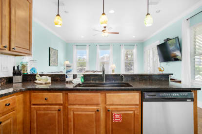 Splish Splash is a fabulous 5-bedroom, pool front home in Villages of Crystal Beach, featuring a spacious open floor plan with TWO gorgeous balconies, TWO living rooms, and TWO master suites. Splish Splash is a 3-story, corner home boasting 10-foot ceilings and 8-foot doorways and a fully equipped kitchen with granite countertops, stainless steel appliances, and a dining table plus breakfast bar. There is a queen master bedroom and a queen sleeper sofa on the first floor. A�queen bedroom and a king master suite with a full-size futon on the second floor, and a bedroom with a queen bed, and a bedroom with a twin over full bunkbed on the third floor along with a second living space with a queen-sized sleeper sofa, allowing sleep accommodations for up to 16 guests. The 2nd floor master suite also features a private kitchenette/wet bar, a flat screen TV, balcony access, and an ensuite with a corner Jacuzzi tub! Enjoy your refreshments on the two balconies or relax comfortably in one of the two living rooms. This luxurious community is about 900 yds from Crystal Beach and includes a complimentary seasonal trolley service to take you to and from the Gulf!