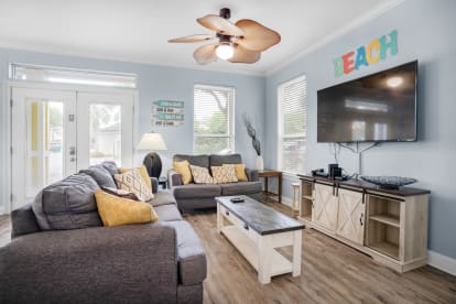 This fabulous pool front home in Villages of Crystal Beach features a spacious open floor plan with Brand NEW furnishings on the main level, a fully equipped kitchen, TWO gorgeous balconies, and TWO living rooms. Deja Blue is a 6BR/3.5BA house that sleeps up to 16 guests. There�s a King Master Suite on the first floor. Additionally, there is a king bedroom, two queen bedrooms, a bunk room, a bedroom with two twin beds, and two sleeper sofas. This magnificent house also has a full-size laundry room with a washer/dryer, parking spots in the driveway, as well as additional overflow parking nearby. This luxurious community is about 900 yds from Crystal Beach and includes a complimentary seasonal trolley service to take you to and from the Gulf. Enjoy your next vacation getaway at Deja Blue!