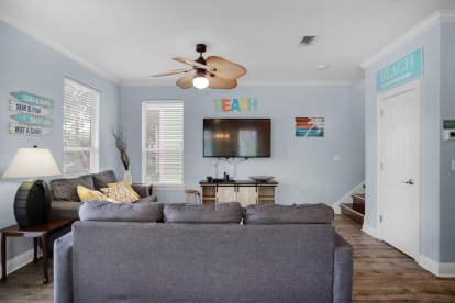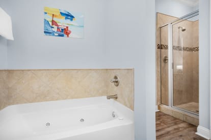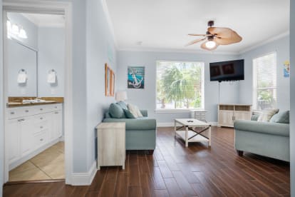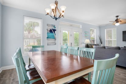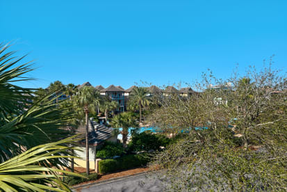 Villages of Crystal Beach is an exclusive, gated community only a few blocks from the beautiful blue waters and white sandy beaches of Destin. You can make the walk on foot or hop on the free seasonal trolley service (Memorial Day through Labor Day): they will even pick you up at the house and drop you off right at the beach! The pool area at Villages of Crystal Beach is a vacation must! The lagoon style zero entry pool is 30,000 square feet of gorgeous, sparkling clear water. There is a spa, tropical landscaping, and plenty of seating areas. It also has surround sound, a flat screen TV, and a grilling area to help you relax and unwind.