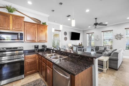 Villages of Crystal Beach - Beach PleaseEnjoy making the best beach memories in this gorgeous, three-story beach home! This home offers plenty of extras that will allow friends and family to relax and unwind after a day at the beach. The first and main level of the home is where the kitchen, living room, and dining area are located. The open layout makes it easy to stay together with your group. The kitchen has all the appliances and utensils needed to prepare delicious beach snacks and finger foods and savory full course meals for the group. The dining table seats six and the breakfast bar adds four more spaces. Kick back and relax on the sofa after a sun-filled day at the beach or at the sparkling shared pool. This level features a laundry room with your very own washer/dryer combo, one bedroom with a king bed, and a full bathroom. On the second floor, you'll come across a bedroom with a king bed and an on-site kitchenette and en-suite bathroom and another bedroom with a queen bed and an en-suite full bathroom. And last, but not least, the upper level offers a well-equipped living area with a large flatscreen TV, a bedroom with two double beds, another bedroom with a twin over twin bunk bed, a full bathroom, and another kitchenette. Leave your worries at home and head to My Key West!