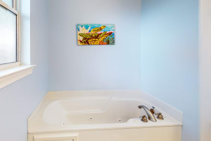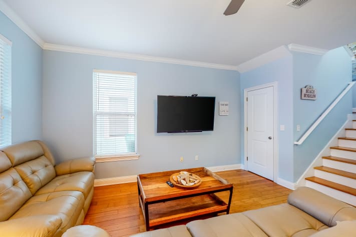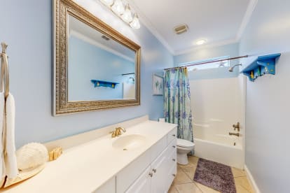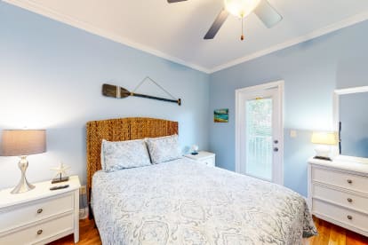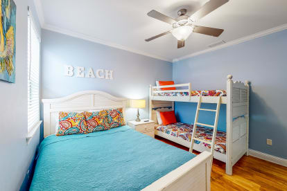 The first main room of the home is straight down the hall from the front door, and it's a beauty! This spacious suite features extra seating and an en suite bathroom with double sinks, a jetted tub, and a standalone shower. Head up the stairs and you'll find the second bedroom (complete with private balcony entrance) just past the upstairs lounge. A full bathroom with a shower/tub combination lies just next door. The final two bedrooms lie at the very end of this hallway - the third bedroom lies to the left, and functions as a bunk room with a fun fish theme. Next door, the fourth bedroom features a lovely stylized sleigh bed in addition to an en suite bathroom with a standalone shower. Each bedroom features a flatscreen TV and ceiling fan for guest comfort.